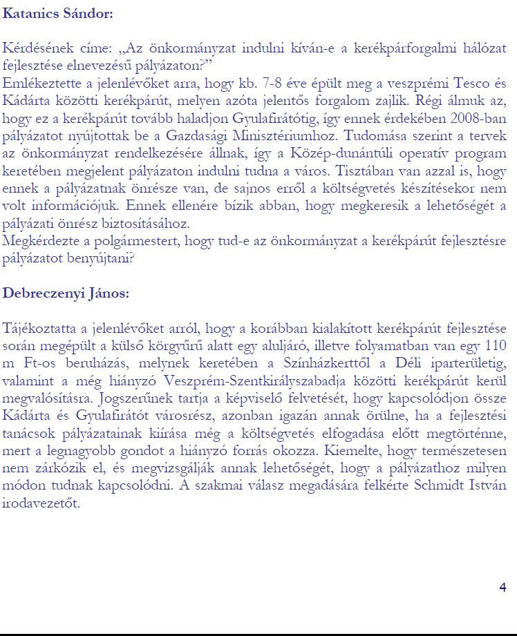 "Brányi Mária, VeszprĂ©m alpolgármestere sajtĂłtájĂ©koztatĂłján kiemelte: a város kategĂłriájában VeszprĂ©m az egyetlen olyan nyertes telepĂĽlĂ©s, amely nem sĂk domborzati viszonyokkal rendelkezik. Az elismerĂ©s fĹ‘kĂ©nt az elmĂşlt Ă©vek fejlesztĂ©seinek köszönhetĹ‘. Az alpolgármester emlĂ©keztetett, hogy kiĂ©pĂĽlt a Balatonalmádi, valamint a Kádárta-GyulafirátĂłt felĂ© vezetĹ‘ bicikliĂşt, Ă©s a városon belĂĽl is bĹ‘vĂĽlt az utak száma." Ezt Ărja a NaplĂł. Most a tudĂłsĂtĂł hallott valamit fĂ©lre, vagy az alpolgármester asszony beszĂ©l mellĂ©? EgyrĂ©szt nincs is mĂ©g kerĂ©kpárĂşt GyulafirátĂłt Ă©s Kádárta között. Ugyan Ă©n tettem erre javaslatot 2009 áprilisában, de a Fideszes többsĂ©g mindent megtett azĂ©rt, hogy akkori pályázati pĂ©nzekbĹ‘l ez ne valĂłsulhasson meg. A város nehĂ©z költsĂ©gvetĂ©si helyzetĂ©re hivatkozott a polgármester. Szentkirályszabadjára Ă©s Balatonalmádiba emlĂ©keim szerint több mint tĂz Ă©ve épĂĽlt meg a kerĂ©kpárĂşt, VeszprĂ©mbĹ‘l Kádártára 2001-2002-ben.