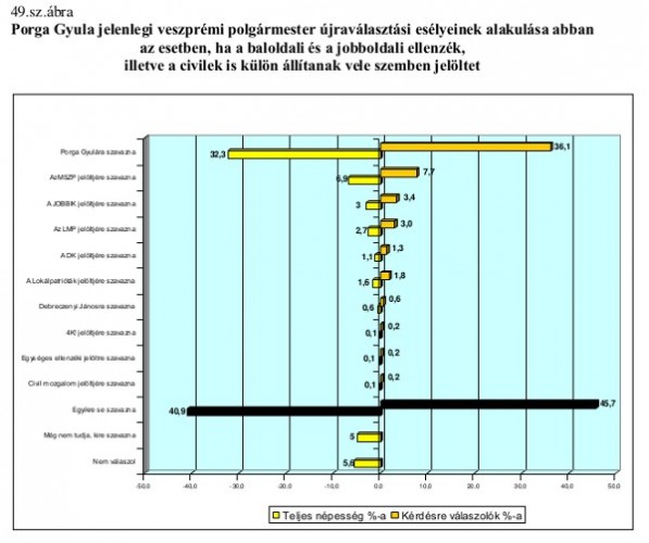 Az ábra fejlĂ©cĂ©n az jĂłl olvashatĂł: Porga Gyula jelenlegi polgármester Ăşjraválasztási esĂ©lyeinek alakulása abban az esetben, ha a baloldali Ă©s jobboldali ellenzĂ©k, illetve a civilek is kĂĽlön állĂtanak vele szemben jelöltet. EbbĹ‘l az ábrábĂłl csak sejteni lehet, hogy a kĂ©rdĂ©sre a 700 fĹ‘ közĂĽl hányan nem válaszolnak. ElĂ©g meglepĹ‘ lenne, ha a 700 fĹ‘ mindössze 5.6 %-a tett volna Ăgy. Persze ha hozzáadjuk azt az 5 %-ot is, akik nem tudják a választ, illetve azokat is, akik az „egyikre sem szavazna” választ adja, akkor azĂ©rt Porga Gyula 36%-os támogatottsága már sokkal Ă©rthetĹ‘bb. (A válaszadĂłk közel 47 % -a számára a „kĂnálatbĂłl” senki sem kellene.) Persze a többi „jelölt”-nek -Debreczenyi Jánost kivĂ©ve- neve sincs. Csak az, hogy melyik párt áll majd vĂ©lhetĹ‘en a ma mĂ©g ismeretlen kihĂvĂł mögött. Porga neve mögĂĽl (nofene) meg Ă©rdekes mĂłdon hiányzik a jelölĹ‘ szervezet, a Fidesz meg a KDNP. Ne felejtsĂĽk, 4 Ă©vvel ezelĹ‘tt ilyenkor Debreczenyi János volt a csĂşcson. Aztán 2010 jĂşniusában egyszer csak elengedtĂ©k a kezĂ©t. S hĂłnapokkal elĹ‘bb mĂ©g hiába mondta Ĺ‘ lesz a Fidesz jelöltje Ăşjra, a veszprĂ©mi „hatalmasságok” nem Ăgy akarták. S mĂ©g azt is elintĂ©ztĂ©k, hogy a önkormányzati kĂ©pviselĹ‘ se lehessen belĹ‘le. Porga Gyula most mĂ©g alkalmas. (Csak meg ne „rugdossák neki is a lábát” az asztal alatt!)