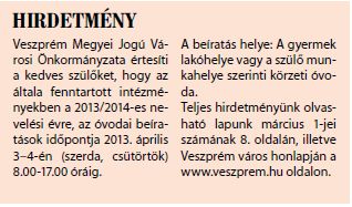 Veszprém Megyei Jogú Városi Önkormányzata értesíti a kedves szülőket, hogy az általa fenntartott intézményekben a 2013/2014-es nevelési évre, az óvodai beíratások időpontja