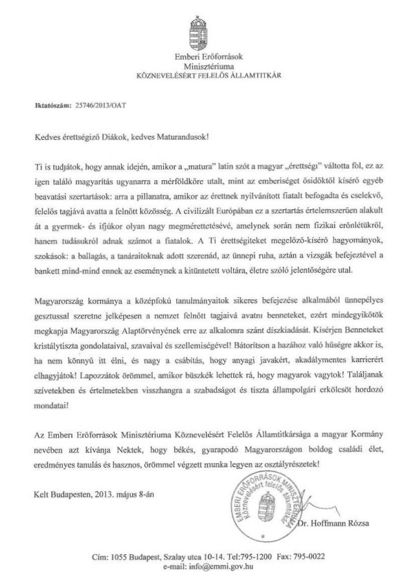 Nem tudom, hogy a levél eljutott-e az államtitkár asszonyhoz. Mi ezúttal tisztelettel tolmácsoltuk neki. Ahogyan ez az újságíróknak dolga.