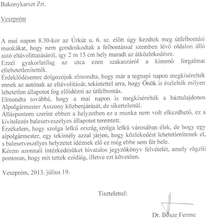 A munkaterület helyszínén járva utasítottam a Punkvíz Kft. szakembereit, mint a Bakonykarszt Zrt. alvállalkozóját, hogy egy helyszínen tartott vaslemezzel tegye lehetővé a munkagödör közelében a biztonságos áthajtást. Mikor az Ön ingatlanját megközelíteni kívánó gépkocsi érkezik, a dolgozók elhelyezik a vaslemezt, majd a kocsi távoztakor folytatják a munkát. A munka befejeztével (még a mai napon) az áthaladást biztosítjuk.