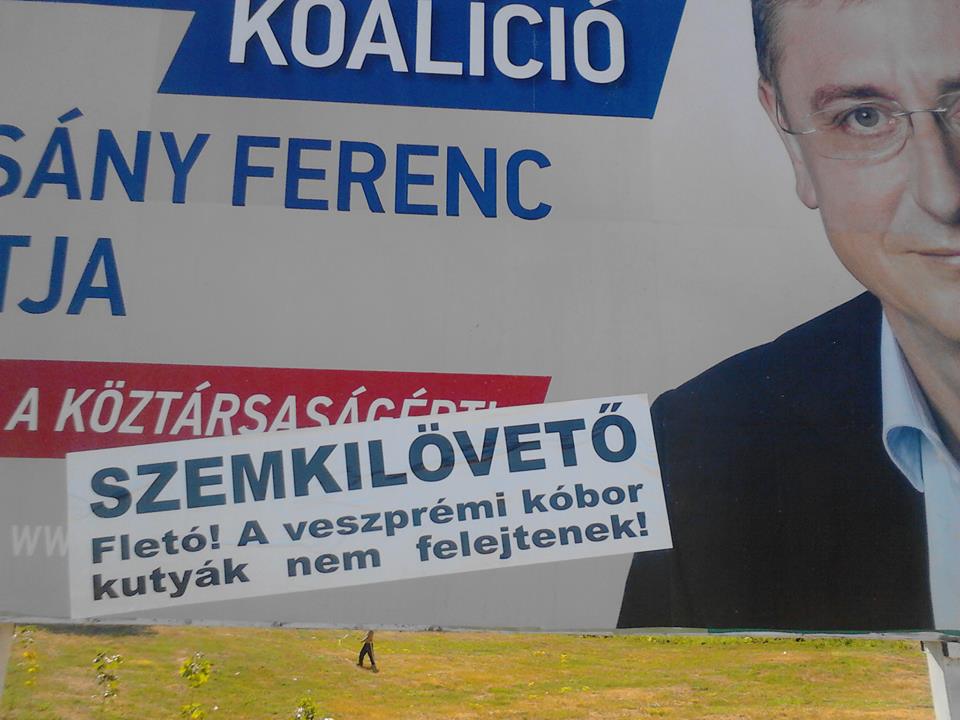 Friss információ: Az Alfahír Hírportálon (amely a hírei és linkjei alapján jól beazonosítható, hogy kikhez tartozik) megjelent egy képes beszámoló, mely szerint nem mindenkinek nyerte el a tetszését Gyurcsány Ferenc óriásplakátja. A portálon megjelenő fotók arról a plakátról készülnek, amelyet még vasárnap délutánig nem rongált meg senki, hisz akkoriban én is ott jártam és láttam, hogy semmi baja. Vélhetően vasárnapról hétfőre virradóra akcióztak a gyáva kóbor kutyák. S akár ők is fotózhattak és küldték el ennek a nagyszerű portálnak a képeket, hisz hétfőn délelőtt leszedtük azt a feliratot, amit ők a portáljukon igyekeznek országnak- világnak megmutatni. Egy másik -a körforgalomhoz közel lévő plakáton viszont rajta hagytuk- had lássa csak mindenki, mennyire tartanak egyesek a Demokratikus Koalíciótól! Mindenesetre az megállapítható: a veszprémi kóbor kutyák jól fizetett fideszesek és/vagy Jobbik szimpatizánsok lettek. |