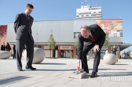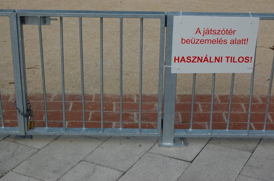 Nemrég rakta le - még szép hogy öltönyben- az utolsó követ is Veszprém fideszes polgármestere, aztán másnap jó néhányat szedtek fel és raktak le még heteken keresztül folyamatosan a felújítást alvállalkozásban végző munkások. Átadták már a „Zöld-ház” (Pártház) mögötti játszóteret is, aztán gyorsan be is zárták a beruházás egyetlen kellemes színfoltját . Azt olvashatjuk a kerítésére kifüggesztett táblán a mai napig (igen a tegnapi avató után egy nappal is) , hogy „A játszótér beüzemelés alatt! Használni tilos!”. Nem zavarta ez persze azokat, akik gyermekeikkel ki akarták próbálni, hisz a kerítésen egy felnőtt minden erőlködés nélkül, simán át tud lépni. A péntek éjjeli aluljárós demonstrációnkon -mivel a játszótér annak közelében van- hallottuk, hogy a hajnalban a szórakozóhelyekről kiáramló részeg fiatalok is nagyon jól érezték ott magukat. Csodálom, hogy oda még nem szereltek fel kamerát. Az aluljáróban már van.