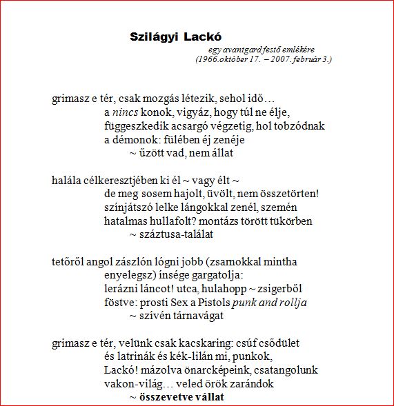 Évekkel később, a róla elnevezett utca-galéria földalatti világában (miközben mécseseinket gyújtogattuk) művészetét – életét, alakját, gondolat- és érzésviharait, sorsát, halálát – idéző, előbb csak sorokká, aztán egyre inkább verssé összeállt harmóniákat és diszharmóniákat, asszonáncokat és disszonáncokat dudorásztam. Mit dudorásztam! Hörögtem. Íme: